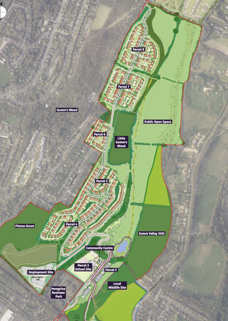 Here’s how Taylor Wimpey envisages its development (above), looking north towards Penn and Tylers Green. Hammersley Lane is on the right. Gomm Road is in the centre, alongside the area marked Parcel 2, with an extended spine road twisting through the development and ending at the Tylers Green end of Cock Lane. Cock Lane itself is on the left of the image.