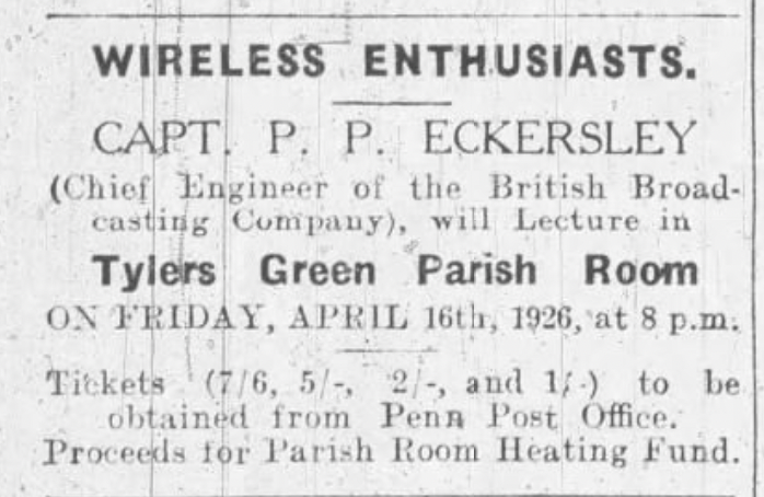 Another engineer, Captain Peter Eckersley, gave a spell-binding talk to a crowded parish room. He was the chief engineer of the British Broadcasting Company, a job he kept when it became the British Broadcasting Corporation nine months later.